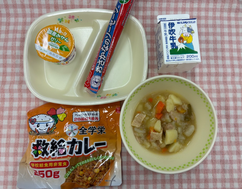 給食センターでも非常食を備蓄しており、1月には子どもたちに防災を意識してもらえるよう『防災メニュー』を給食で実施しました。そのときのメニューを少しご紹介します。