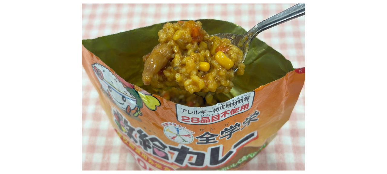 袋を開ければそのまま常温でも食べられる非常食です。給食では温めて提供しましたが、災害時にはそのままでも食べられます。