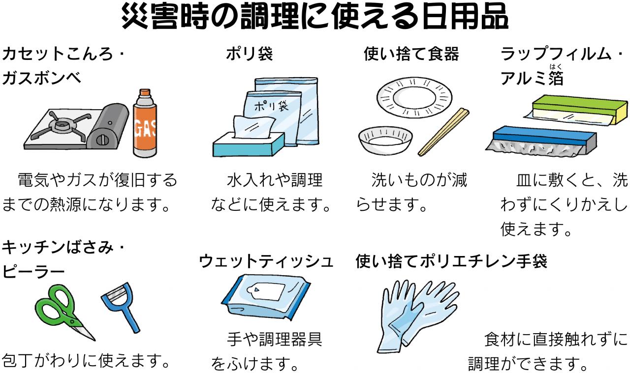でも一番大事なのは、普段から食べ慣れているものをストックしておくことです。ひと工夫で、災害時でもホッとする食事ができるかもしれません。また、食べ物だけではなく、調理に使う日用品や便利なアイテムも一緒に準備しておくと安心です。