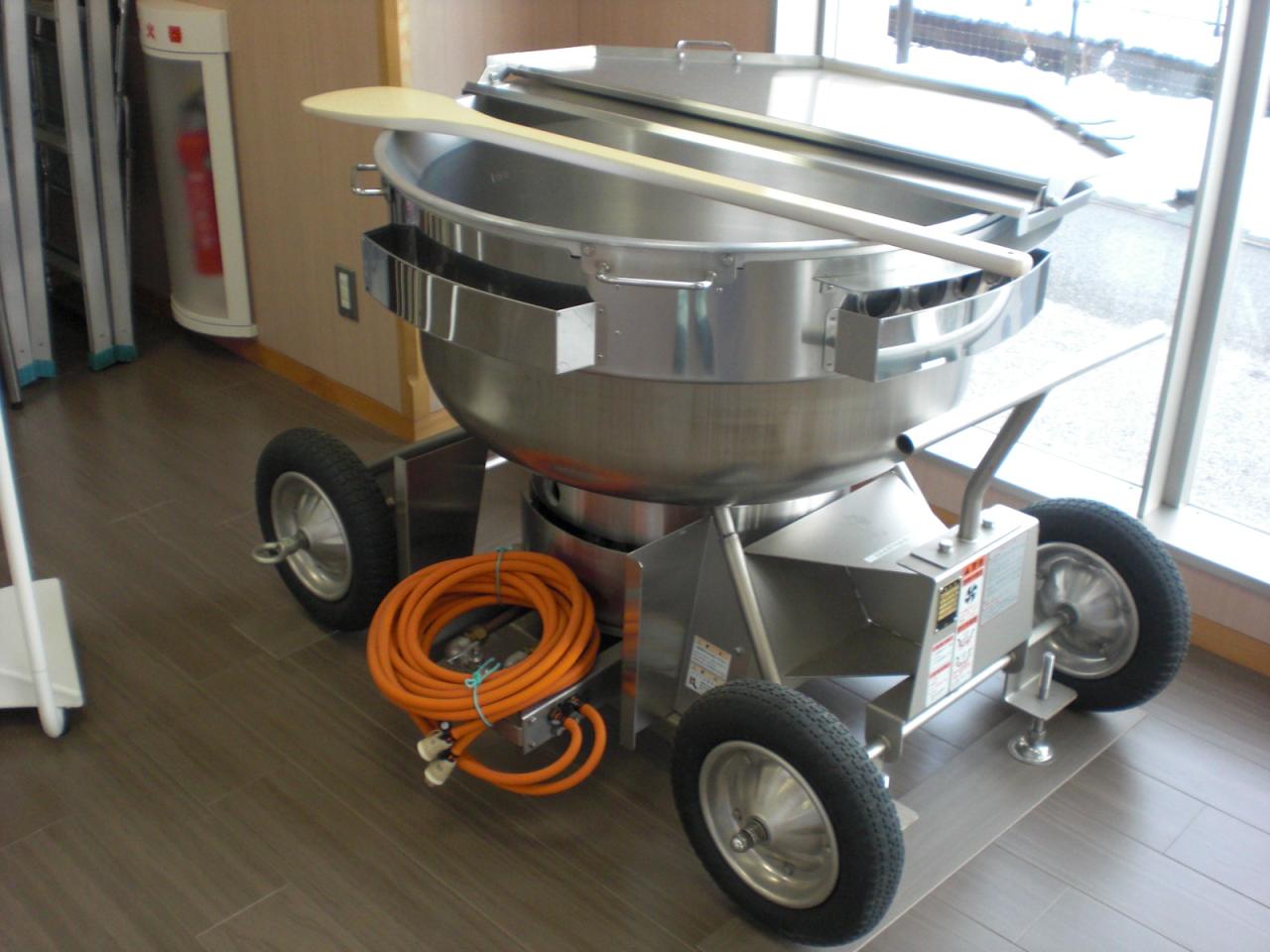 長浜市北部給食センターでは、災害等の非常時に、大量の煮炊きもの(約300食)ができる移動式の「煮炊釜」を常備し、万が一の事態に備えています。