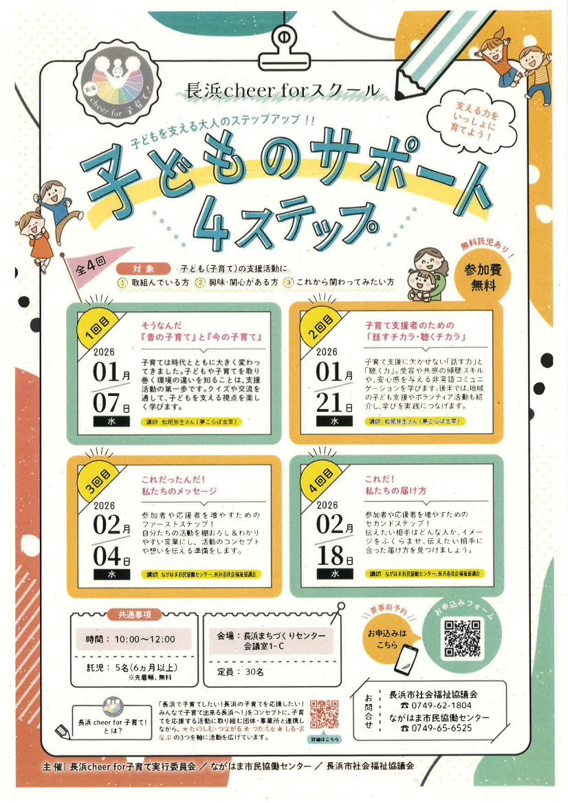 2026年1月7日(水)から2月18日(水)までの期間、隔週水曜日に全4回にわたり、長浜まちづくりセンターにて「子どものサポート4ステップ」を開催します。子どもの支援活動をされている方、興味のある方を対象にしています。