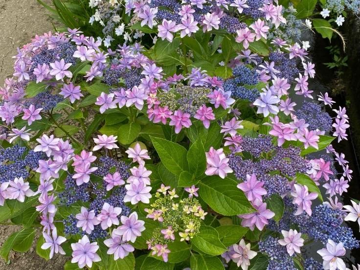 額アジサイ(ガクアジサイ)という種類で、きれいな花弁が額縁のように、粒々の小さな花を囲んで咲きます。