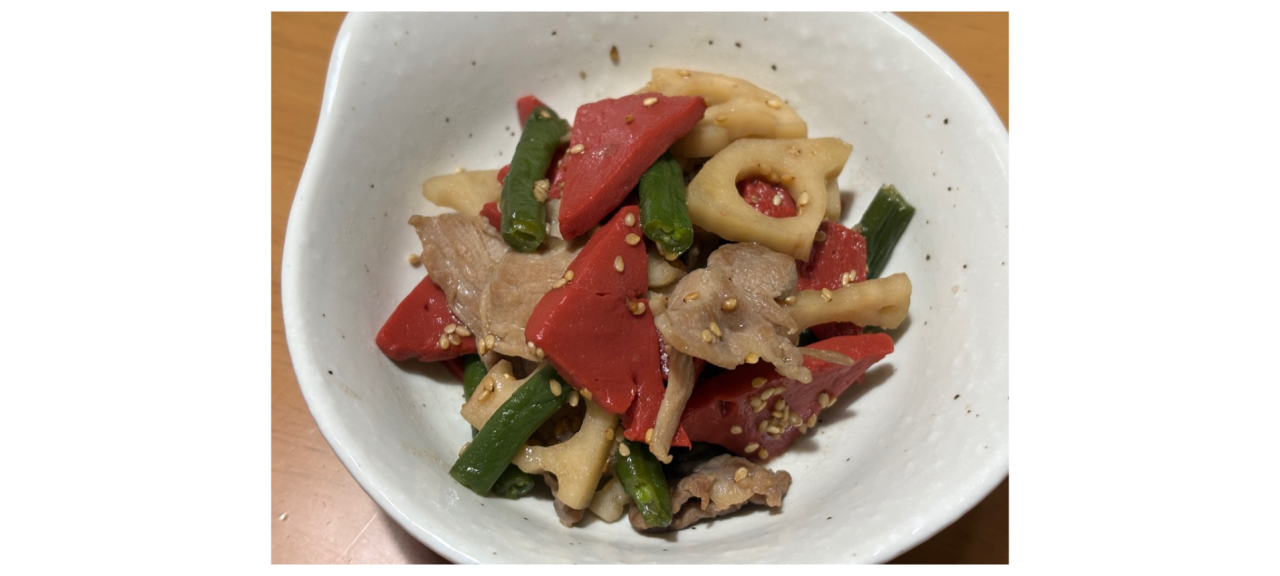 ①豚肉は細かめに切る。赤こんにゃくは三角切り、れんこんはいちょう切り、いんげんまめは3㎝幅に切る。