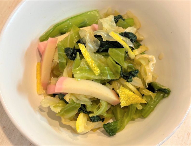 ③混ぜ合わせたAにキャベツ、小松菜、かまぼこを入れて混ぜる。