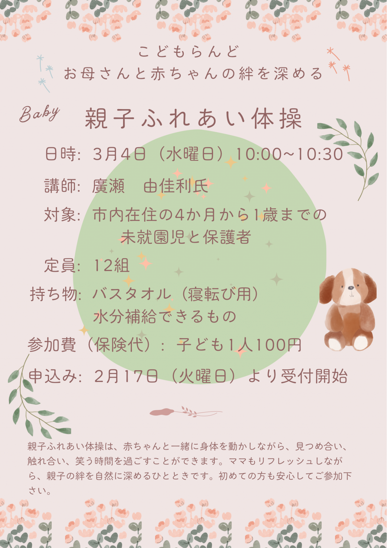 【対象】市内在住の4か月から1歳までの未就園児と保護者