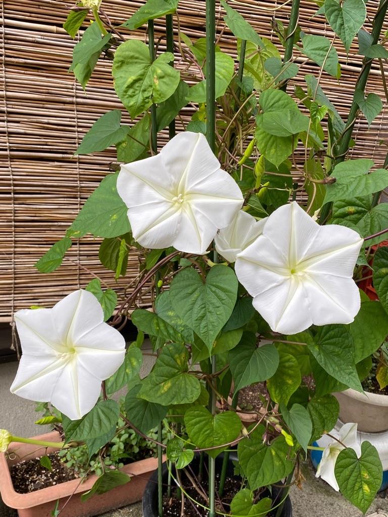 実は、白色の花は、アサガオ(朝顔)でも、ユウガオ(夕顔)でもなくって、ヨルガオ(夜顔)なんですよ。夜暗くなるころから花が開きだします。