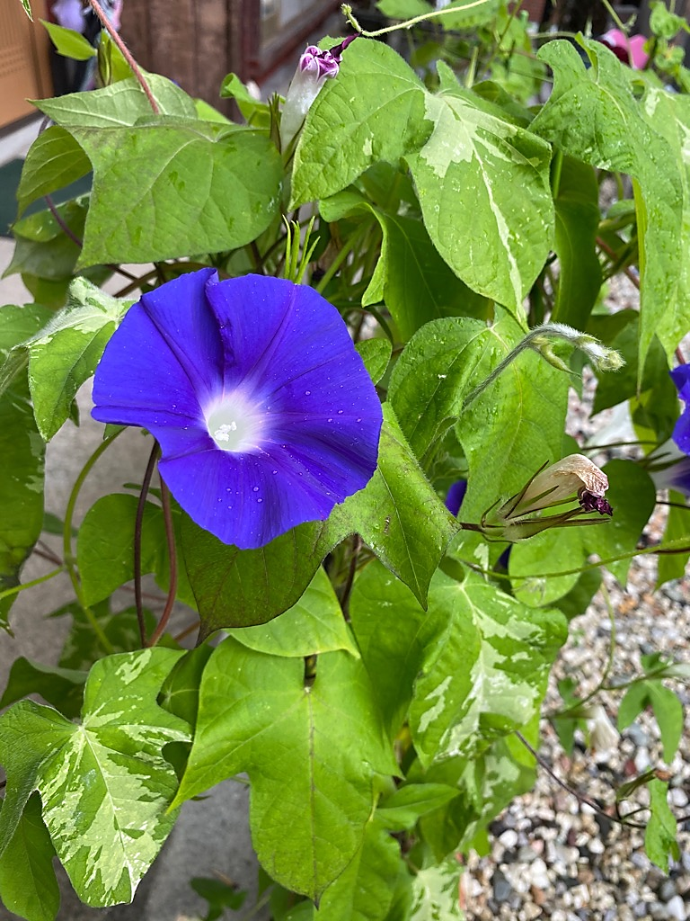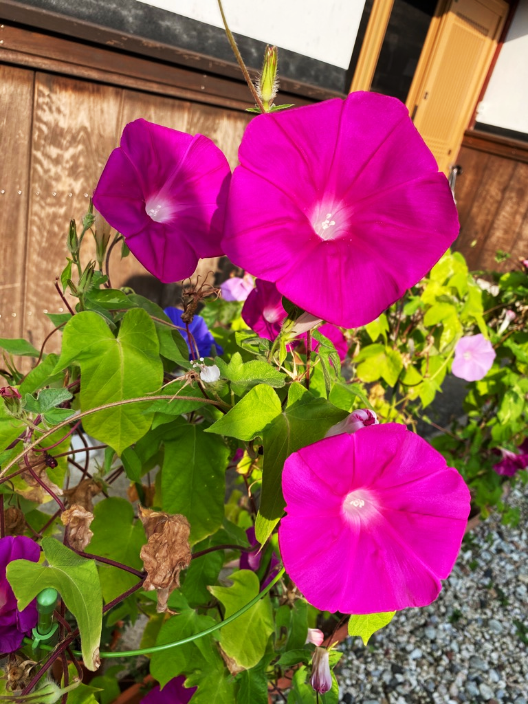 我が家では、いろんな色のアサガオが、朝日を浴びて元気いっぱいに咲いています。