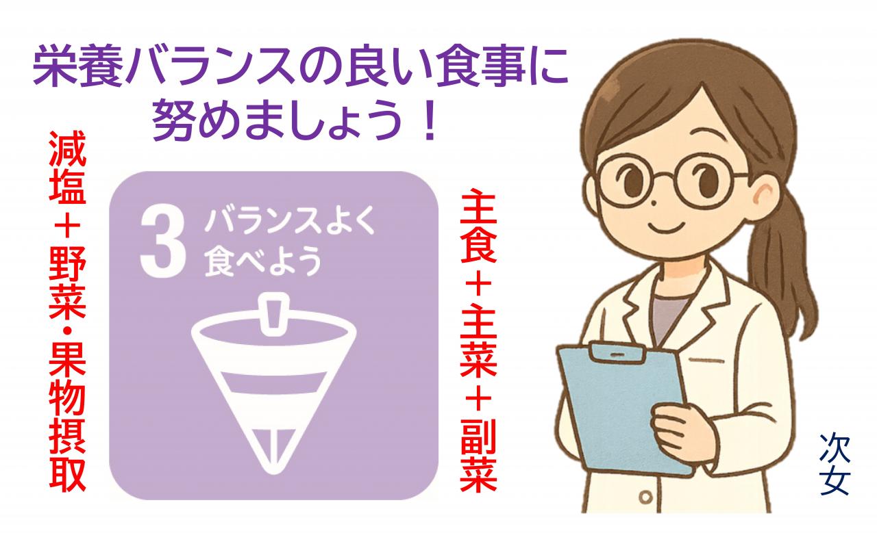 栄養バランスを整えるポイントは「主食」「主菜」「副菜」をそろえることです。色々な食品を食べることができて自然と栄養のバランスが整いますよ。
