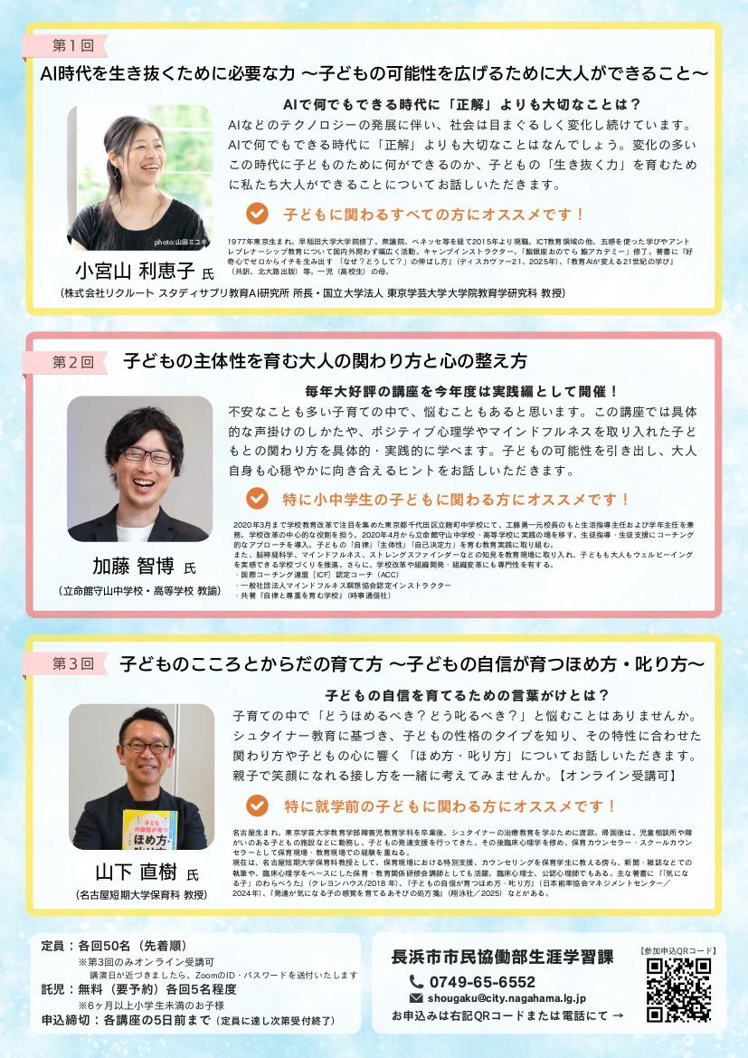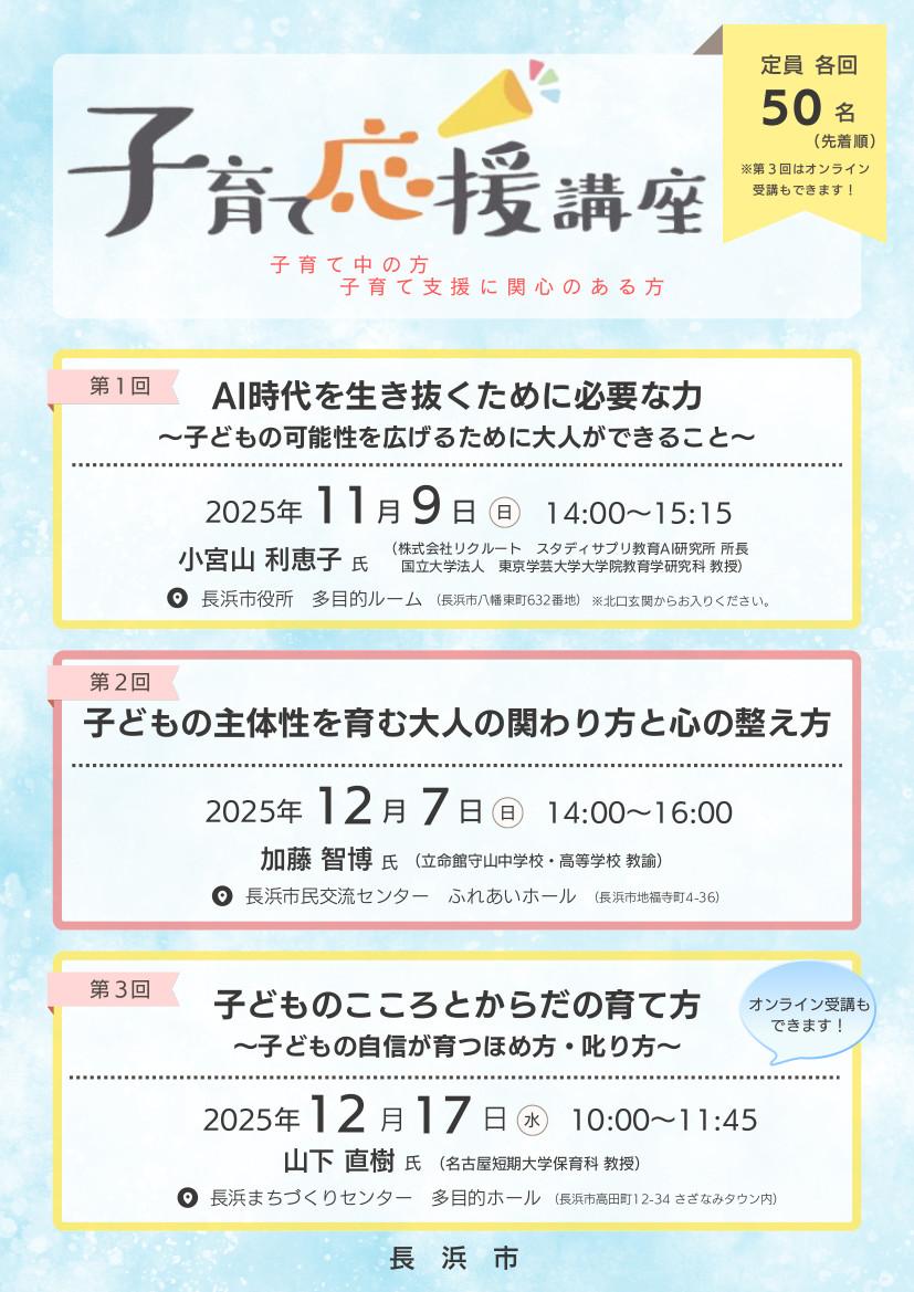 子育て中の保護者や子育て支援に関わっておられる方に役立つ講座を開催します。子どもへの声掛けや関わり方など、子育ての知識や、無理なく楽しく子どもを育むヒントが学べます。