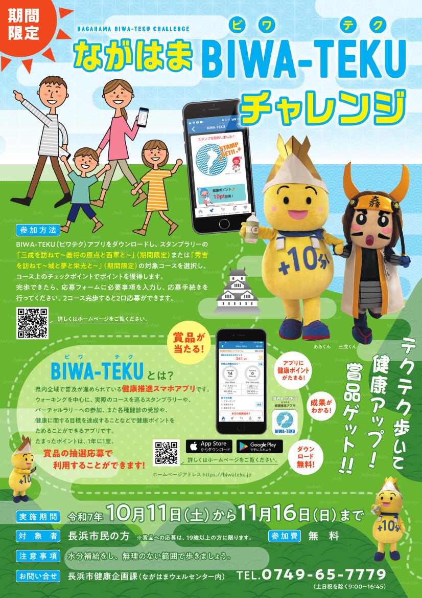 毎年好評の「ながはまBIWA-TEKUチャレンジ」を今年も実施しています。スマホに「BIWA-TEKU」アプリをダウンロードして、対象のスタンプラリーを達成すると賞品に応募できます。