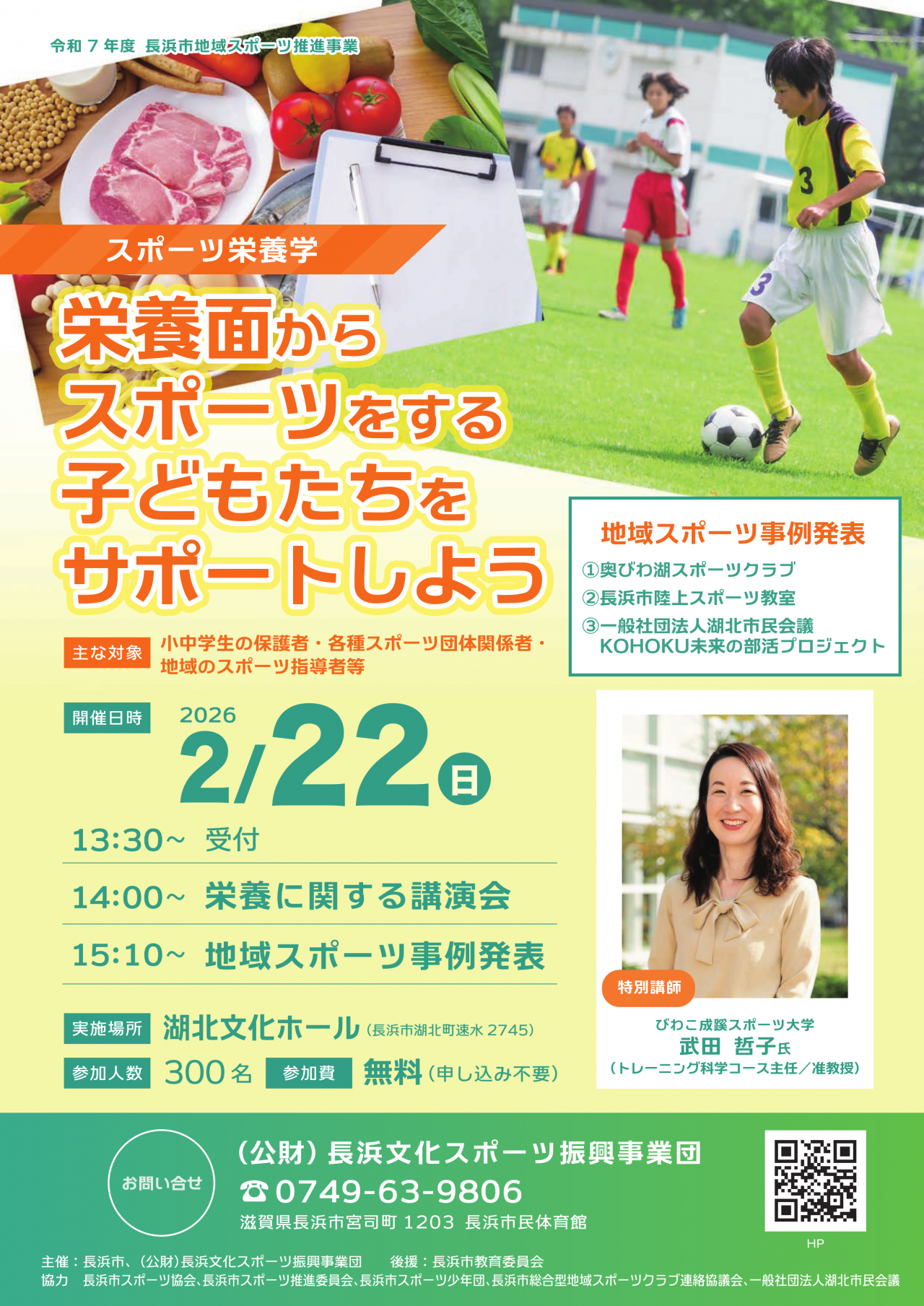 びわこ成蹊スポーツ大学の武田哲子准教授をお招きし、「栄養面からスポーツをする子どもたちをサポートしよう」の題目で講演をしていただきます。