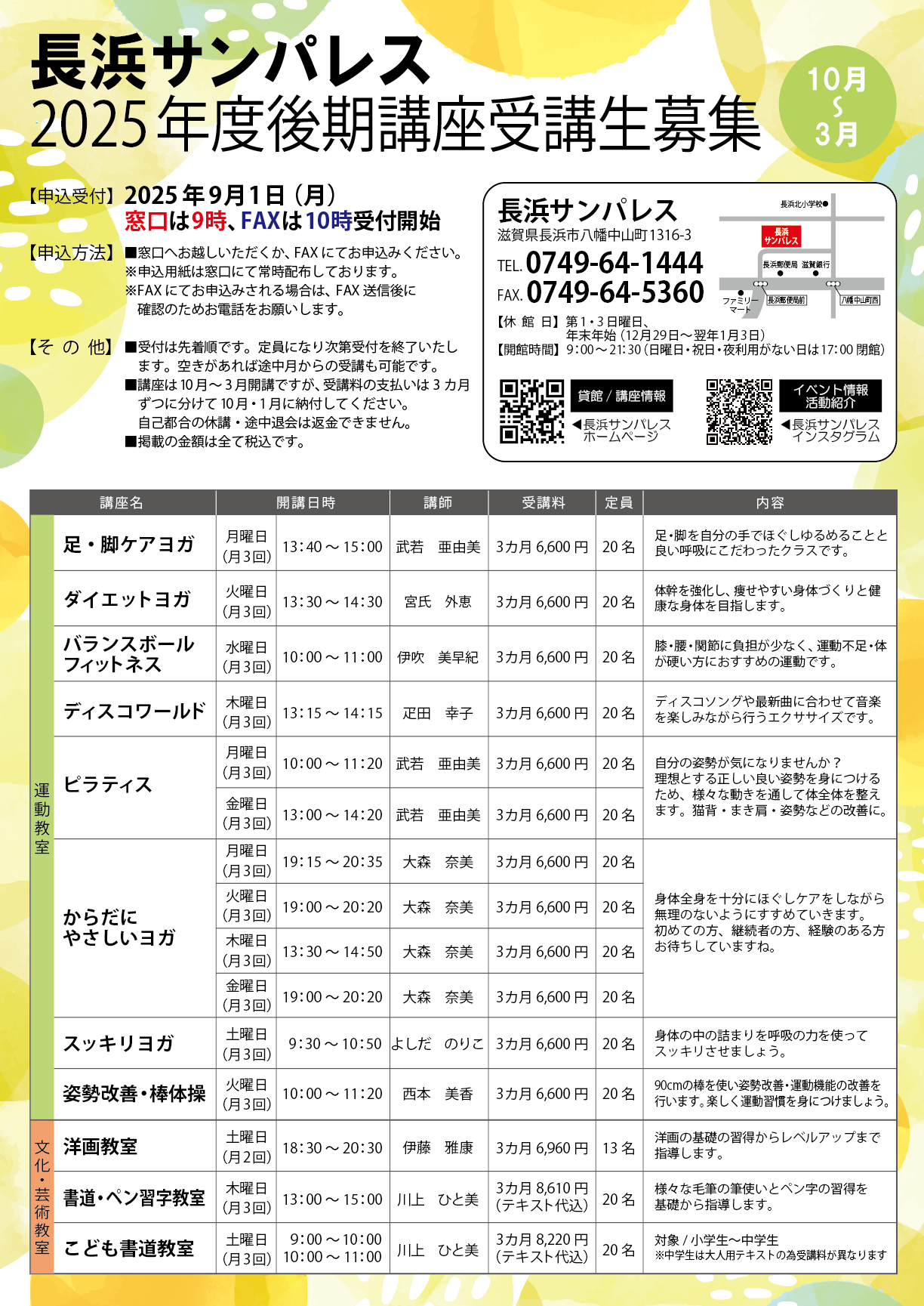 長浜サンパレスでは、こども~大人が学べる様々な生涯学習教室を開講しています。生涯学習講座の後期(10月~3月)受講受付が9月1日より始まりました。一緒に楽しく体を動かしませんか?